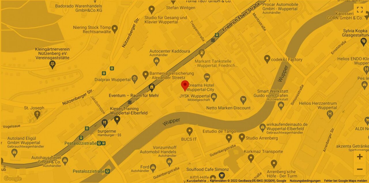 Abfahrt Wuppertal-Karternberg nehmen. Auf Briller Straße nach Südosten Richtung Elberfeld starten. Nach 1,3 km am Robert-Daum-Platz nach rechts in die Friedrich-Ebert-Straße abbiegen. Nach ca. 500 m links in die Hofeinfahrt einfahren. (Hinweisschild Einsvierdrei) und nach links halten. Ein ausgewiesener Patient_innenparkplatz (Nr. 8) befindet sich im hinteren Innenhof.